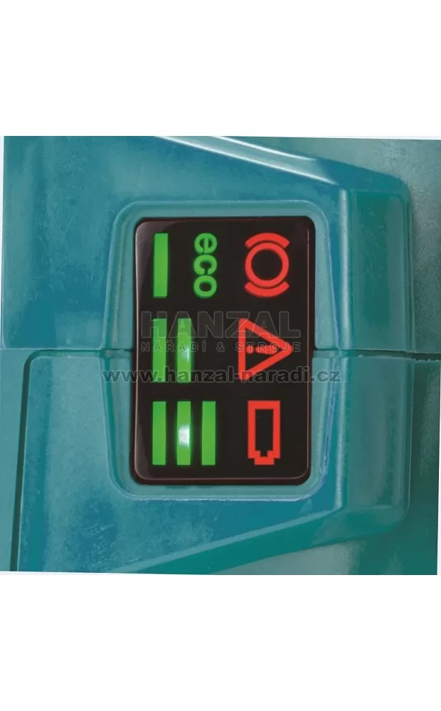 • Indikace vybití akumulátoru, přetížení/přehřátí stroje, spuštění řetězové brzdy nebo zvolené rychlosti