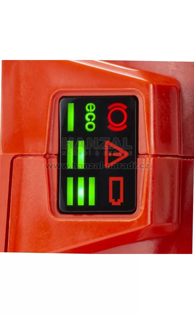 • Indikace vybití akumulátoru, přetížení/přehřátí stroje, spuštění řetězové brzdy nebo zvolené rychlosti