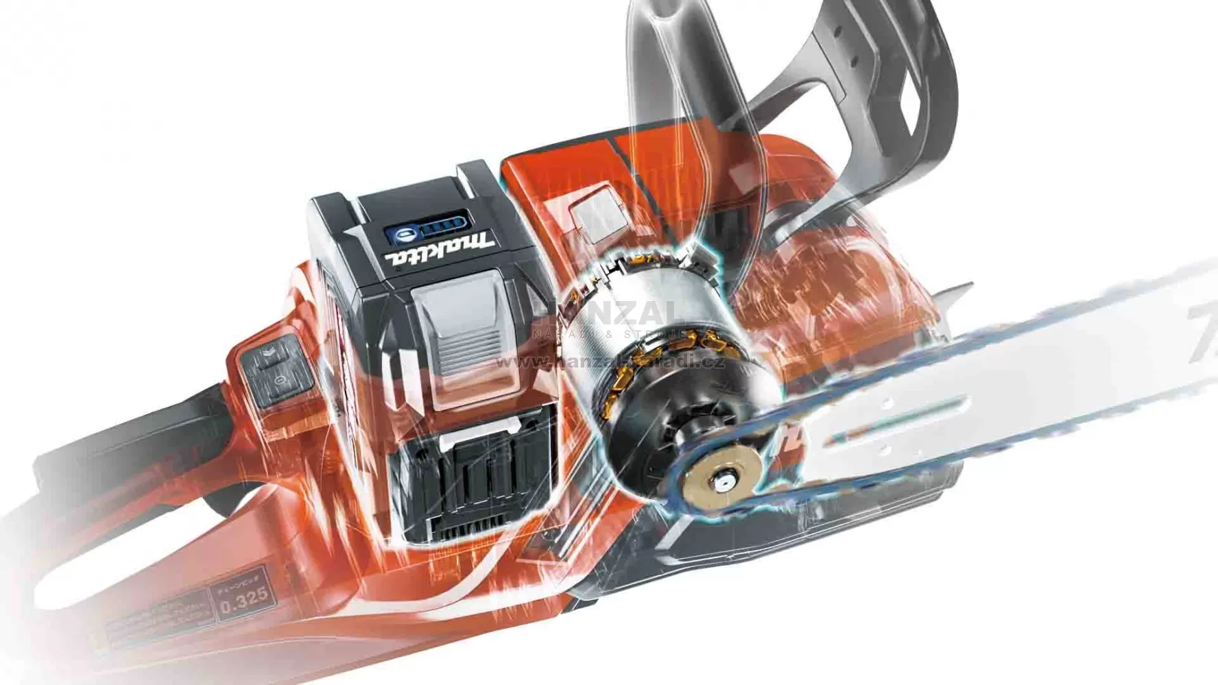 • Velmi silný bezuhlíkový motor 2,8 kW (výkon s BL4080H) je napojený přímo na řetězku