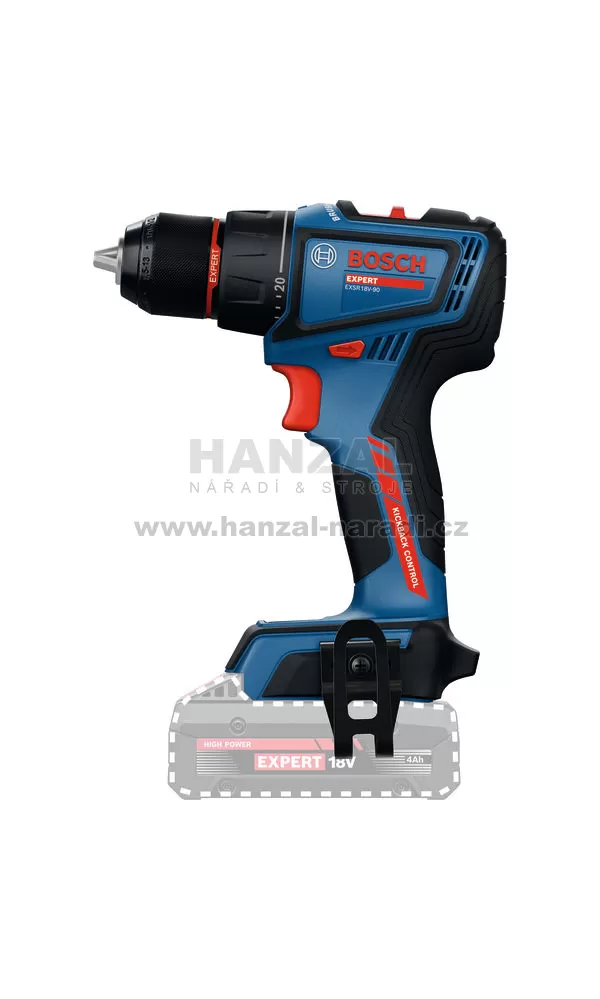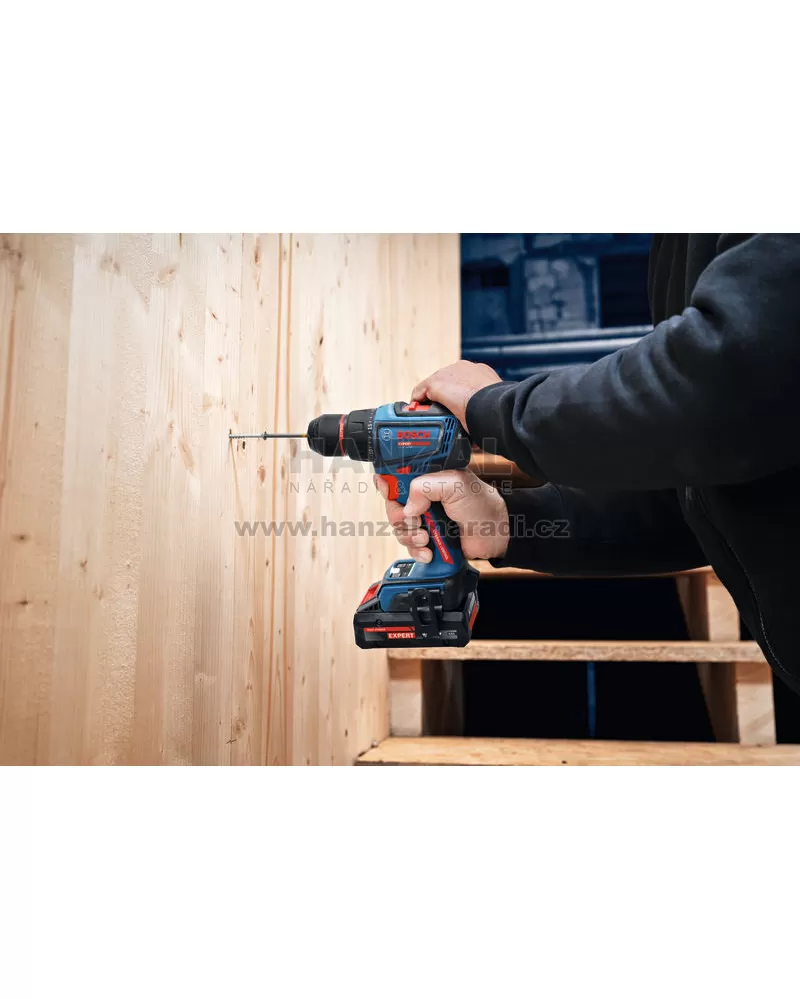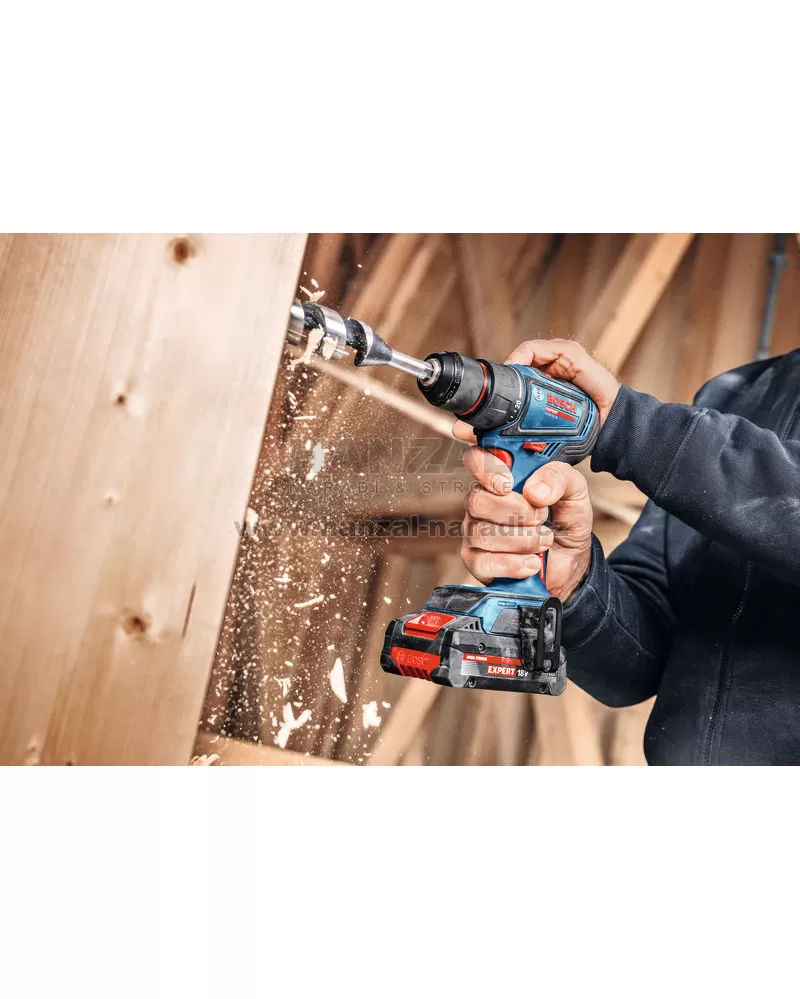 EXSR18V-90 EXPERT je špičkový vrtací šroubovák určený pro vrtání do dřeva s maximálním průměrem 68 mm a do oceli až do průměru 13 mm. Kompatibilní s 18V systémem Bosch Professional a aliancí akumulátorů různých značek AMPShare.