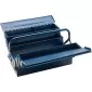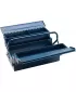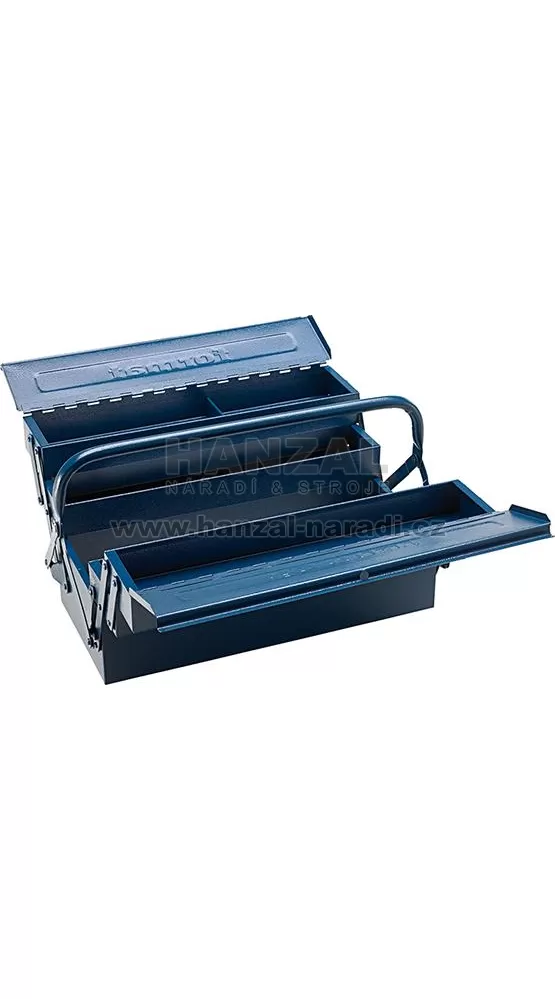 Provedení: Z ocelového plechu, uvnitř a vně lakovaná modrým kladívkovým lakem, s překlápěcím držadlem a automatickou funkcí zavírání skříňky na nářadí při nadzvednutí držadla. Rozložitelná díky silným nýtovaným závěsům. 5 dílná, zamykatelná visacím zámkem (není součástí dodávky).