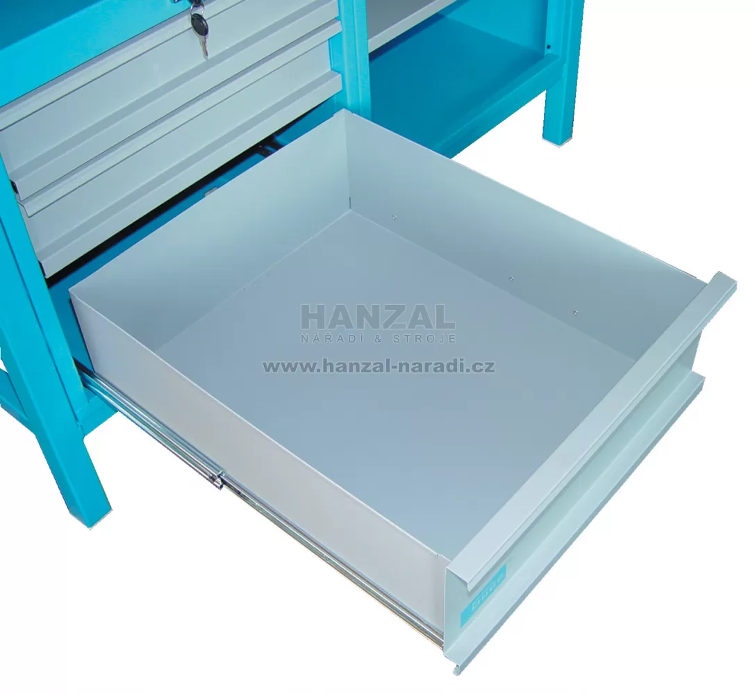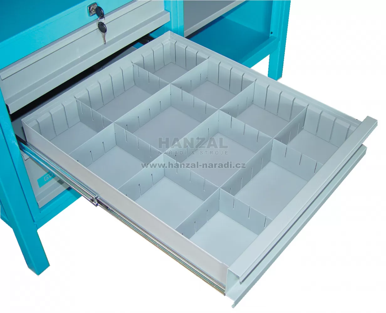 • Vybavení: 3-zásuvková uzamykatelná skříňka (2 zásuvky - výška: 85 mm/1 zásuvka - výška: 165 mm; centrální uzamykání cylindrickým zámkem - 2 klíče; úplný rozsah vyložení všech zásuvek v celé délce; pohyb zásuvek v profesionálních vodicích lištách; vrchní zásuvky připraveny pro použití vnitřních dělicích příček)