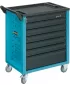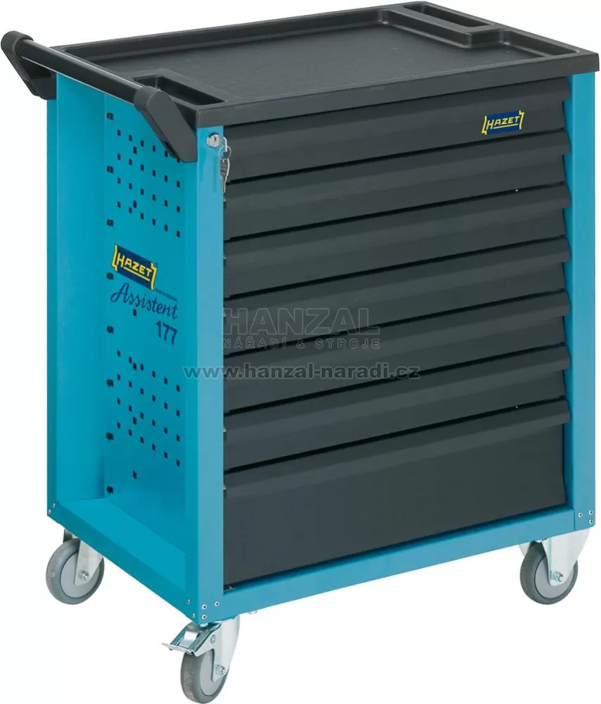 Provedení: Stabilní konstrukce z ocelového plechu, válečkový výsuv zásuvek, jednotlivé blokování proti nežádoucímu otevření během přesunu. Základní výbava obsahuje dělicí plech pro každou zásuvku. Boční stěny mají čtvercové děrování, namontované díly budou chráněny před poškozením zataženými a v rámci rozměrů vozíku namontovanými bočními stěnami. Centrálně uzamykatelný pomocí cylindrického zámku. Pracovní deska z plastu odolného proti rozpouštědlům, se 2 integrovanými úložnými prostory. Se dvěma velkými kolečky uloženými na kuličkových ložiskách pro vysoká zatížení (Ø 100 mm), 2 otočné kolečky, na jedné straně s brzdami koleček (úplné zastavení) pro stabilitu ve všech směrech. Všechna kola jsou vybavena ochranou ložiska, která ložiska chrání před nečistotami a nitěmi. Povrch odolný proti poškrábání, práškové lakování, korpus v modré barvě Hazet, zásuvky černé.