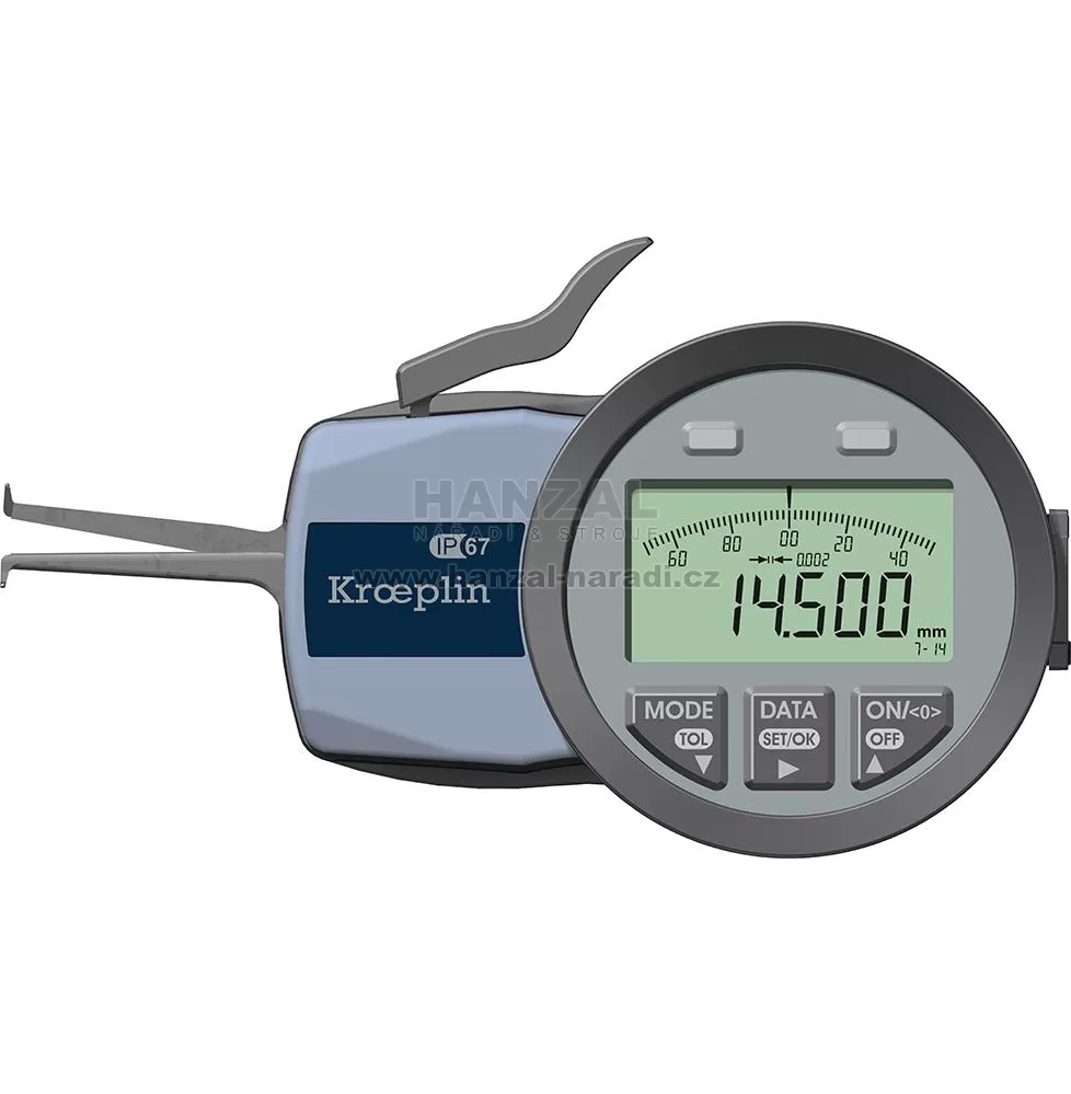 Funkce: Absolutní a relativní měření, přepínání mm/palce, červeno-zelená kontrolka pro měření v tolerancích, přepnutí rozlišení měření.