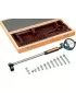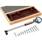 Provedení: Automatické centrování, vychylovací prvek pro přenos dráhy snímacího kolíku bez vůle na měřicí stupnici. Přesnost opakování ≤ 0,5 µm. Odpružený středicí talíř umožňuje měření nezávisle na poloze. Snímací kolík z tvrdokovu. Dodáváme včetně držáku, pevným měřicím kolíkem, měřicími talíři a dokladem o kalibraci z výroby, v dřevěném boxu.