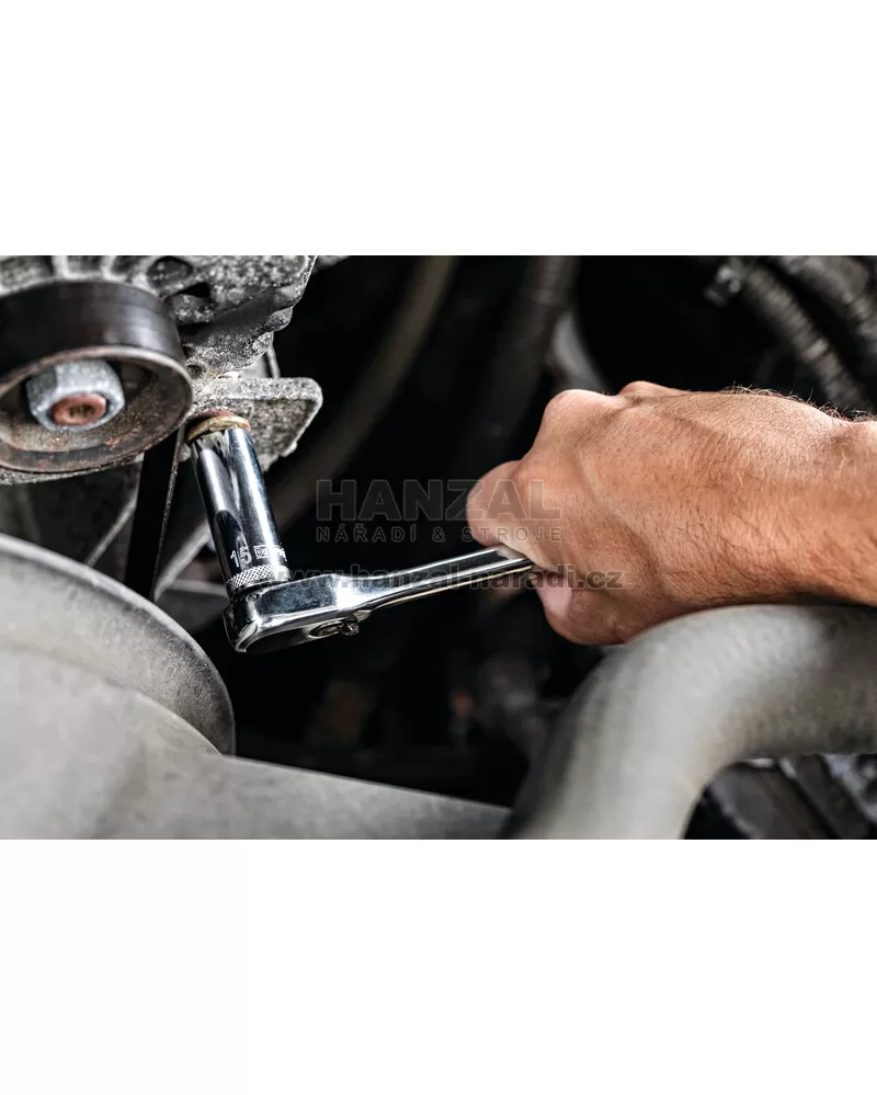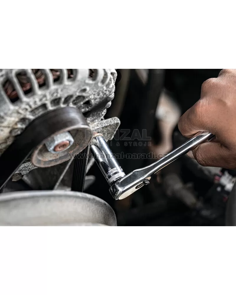 s robustními kovovými západkami. Ráčny se 72 zuby s tlačítkem pro rychlé uvolnění usnadňují a urychlují výměny nástrčných klíčů během práce. Kompletně leštěný povrch poskytuje ochranu před působením koroze a dodává tomuto nářadí klasický vzhled.