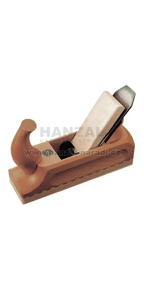 Provedení: Z pařeného bukového dřeva, lakovaného, se silným přilepeným habrovým spodkem. S ochranou rukou, úderným knoflíkem a hoblíkovým nožem, připraveným k použití. Integrované opěrné ložisko klínu zabraňuje štěpení tělesa hoblíku i při nejsilnějším zaklínění.
