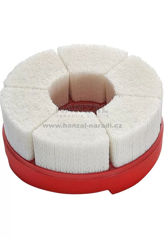Provedení: Velmi husté plné osazení ze zrnitých, obzvláště tuhých a otěruvzdorných polyamidových vláken. Otvor s dvojitou drážkou. Vhodný pro upínač pro nástrčné frézy (DIN 6357) nebo upnutí kombinovaného frézovacího trnu (DIN 6358).