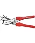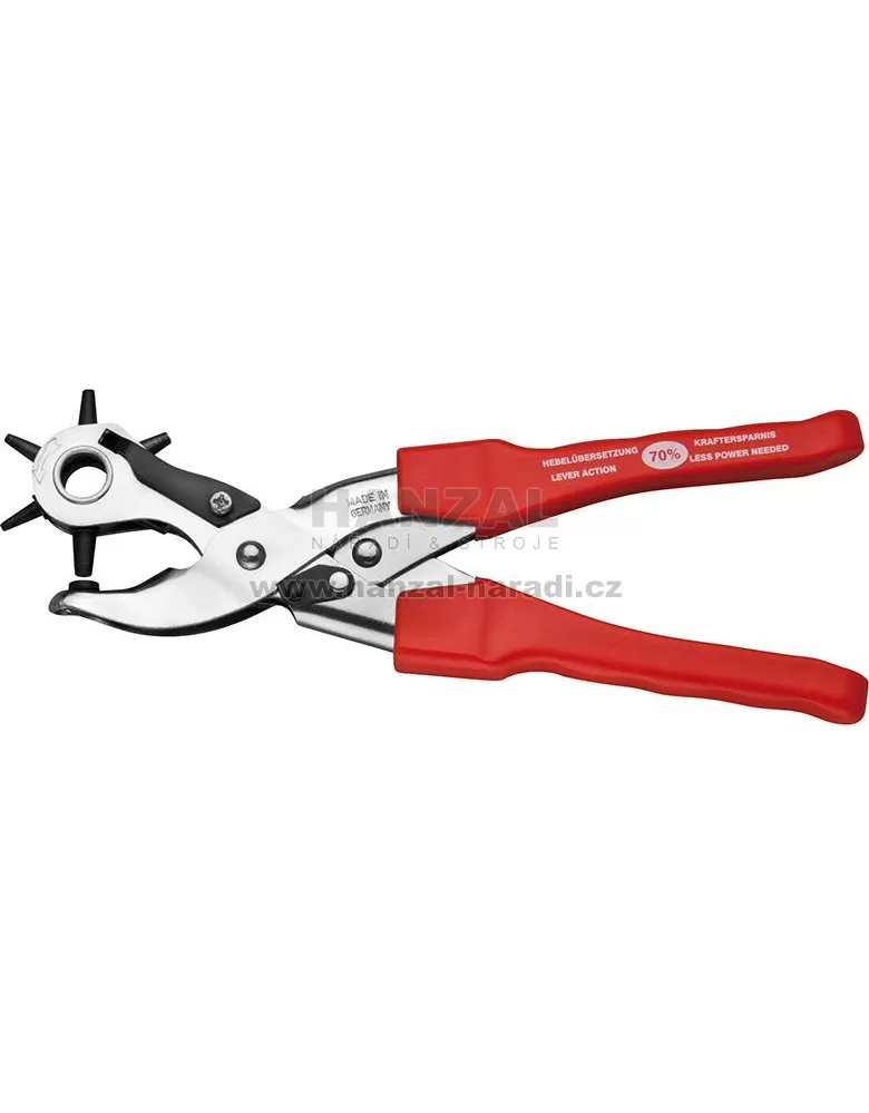 Provedení: Tělo kleští z vysoce pevné speciální oceli, poniklované, s otočným kolečkem a aretací. 70% úspora síly díky pákovému převodu. Se zobrazením velikosti děr (průzor) a ergonomicky tvarovanými rukojeťmi. Předmontované, vyměnitelné dírkovače.