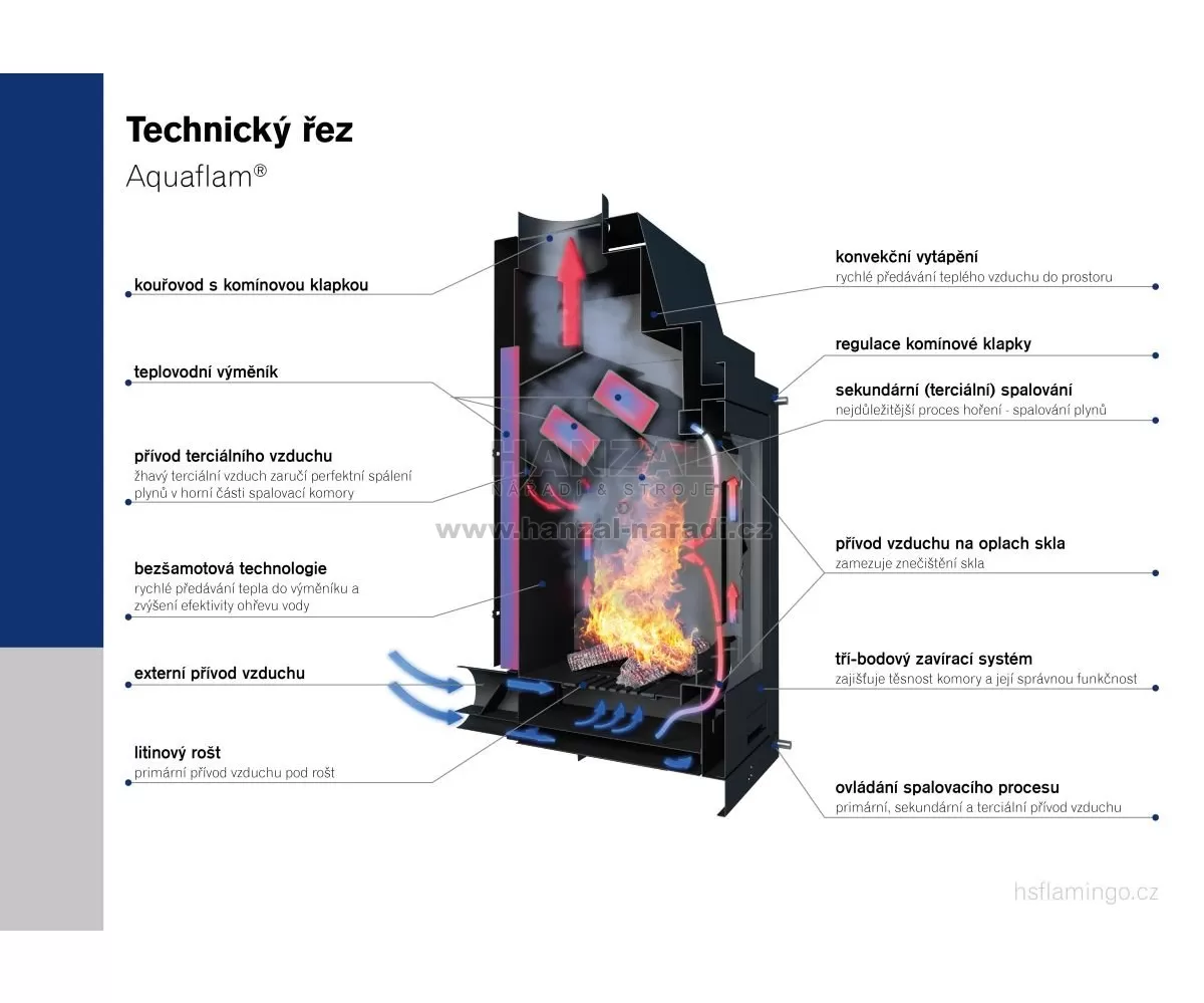 Krbová kamna AQUAFLAM 12 mají mnoho nadstandardních doplňků, čímž velmi výrazně předhání konkurenční výrobky. Inovativní prvky směřují především ke zlepšení obsluhy krbových kamen. Použitý materiál je pečlivě vybírán tak, aby dosahoval nejvyšší kvality. Pro bezpečnost zákazníka jsou krbová kamna vybavena standardně ochlazovací smyčkou a stále otevřeným terciárním vzduchem, který zabraňuje hromadění plynů ve spalovací komoře. Základní a automatická regulace navíc zavírá přívod vzduchu při přetopení. Krbová kamna AQUAFLAM dosáhla na nejpřísnější evropské normy jako jsou BImSchV – Stufe 2, 15a B-VG, DINplus, Flamme Verte.