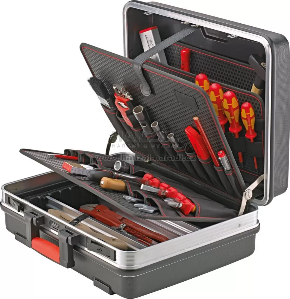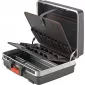 Provedení: Z plastu ABS odolného proti opotřebení a vlhkosti, černého, s pevnými stěnami ze speciálního plastu pro odolnost proti poškrábání, tvarovou stabilitu, a odolnost proti vlhkosti, tukům a chemikáliím, se stabilní rukojetí s komfortními měkkými vložkami. Skořepina dna s výškou 58 mm, volně rozdělitelná. Se skrytými rastrovými závěsy, bezpečnostním držákem víka, kufr zatížitelný až do 25 kg, dvojitý rám z hliníku s ochranou proti nárazu. Velmi stabilní a s ochrannými, integrovanými kluznými lištami. Zamykatelná na 2 klopné cylindrické zámky a 1 kódový zámek. Dodává se bez obsahu.