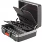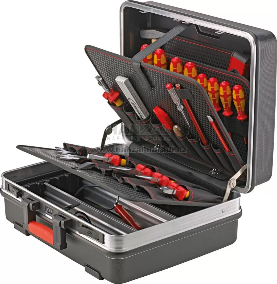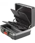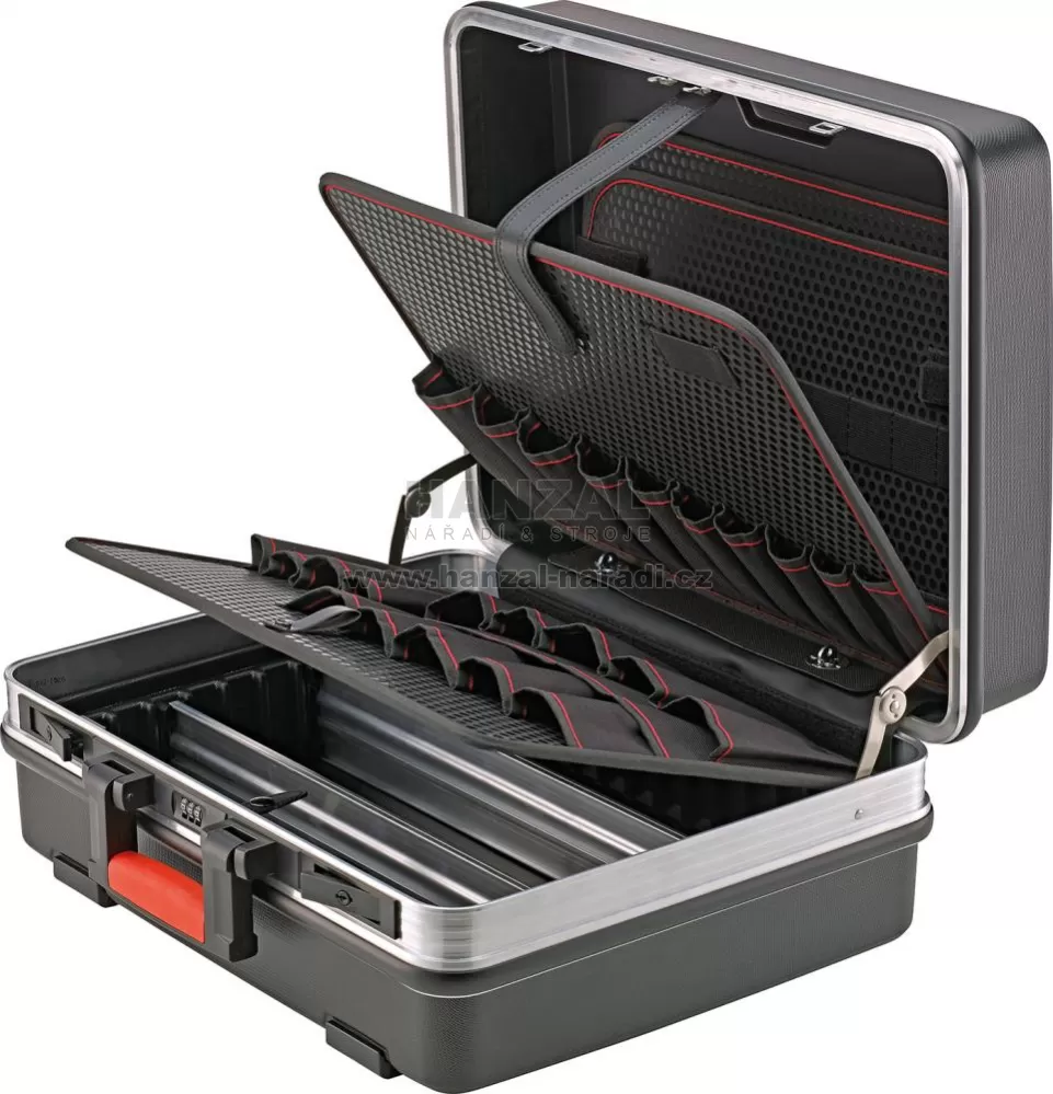 Provedení: Z plastu ABS odolného proti opotřebení a vlhkosti, černého, s pevnými stěnami ze speciálního plastu pro odolnost proti poškrábání, tvarovou stabilitu, a odolnost proti vlhkosti, tukům a chemikáliím, se stabilní rukojetí s komfortními měkkými vložkami. Skořepina dna s výškou 58 mm, volně rozdělitelná. Se skrytými rastrovými závěsy, bezpečnostním držákem víka, kufr zatížitelný až do 30 kg, dvojitý rám z hliníku s ochranou proti nárazu. Velmi stabilní a s ochrannými, integrovanými kluznými lištami. Zamykatelná na 2 klopné cylindrické zámky a 1 kódový zámek. Dodává se bez obsahu.