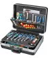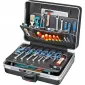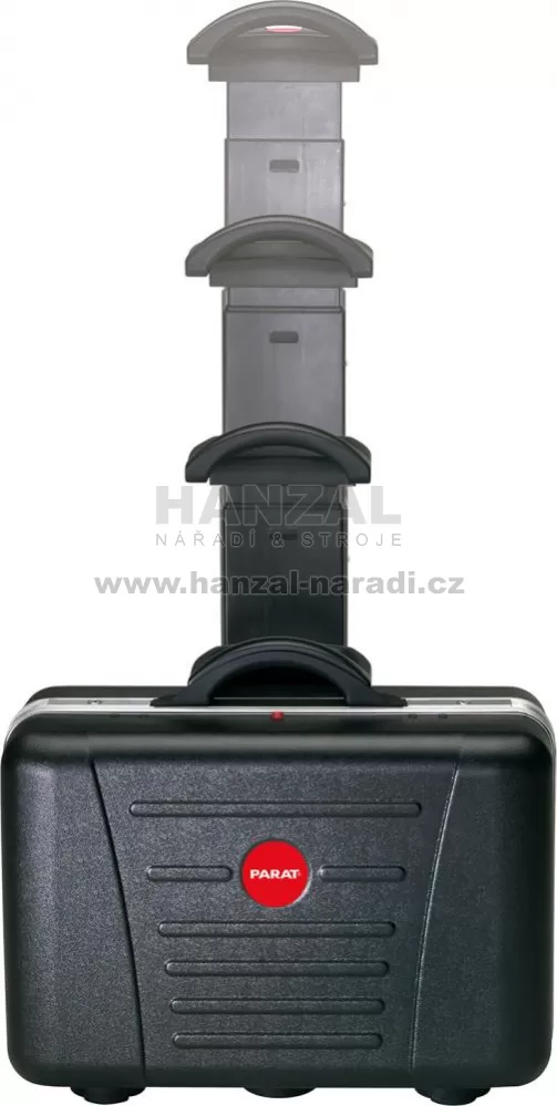 Provedení: Z robustního, nerozbitelného, teplotně odolného plastu X-ABS, odolného proti poškrábání, černý, s pevnými stěnami na nářadí z materiálu Con-Pearl® pro odolnost proti poškrábání, tvarovou stabilitu, a odolnost proti vlhkosti, tukům a chemikáliím, se stabilním, práškově lakovaným 4 násobným teleskopickým výsuvem a extra širokými pogumovanými kolečky. Velmi stabilní skrz široký rozvor kol. S pozinkovanými a aretovanými kovovými kloubovými závěsy, kufr zatížitelný až do 30 kg, dvojitý rám z hliníku. Zamykatelný skrze 2 klopné cylindrické zámky. Model vhodný pro přepravu letadlem. Dodává se bez obsahu.