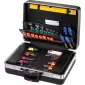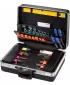Provedení: Z robustního, nerozbitelného, teplotně odolného plastu X-ABS, odolného proti poškrábání, černý, s pevnými stěnami na nářadí z materiálu Con-Pearl® pro odolnost proti poškrábání, tvarovou stabilitu, a odolnost proti vlhkosti, tukům a chemikáliím, se stabilním, práškově lakovaným 4 násobným teleskopickým výsuvem a extra širokými pogumovanými kolečky. Velmi stabilní skrz široký rozvor kol. S pozinkovanými a aretovanými kovovými kloubovými závěsy, kufr zatížitelný až do 30 kg, dvojitý rám z hliníku. Zamykatelný skrze 2 klopné cylindrické zámky. Model vhodný pro přepravu letadlem. Dodává se bez obsahu.