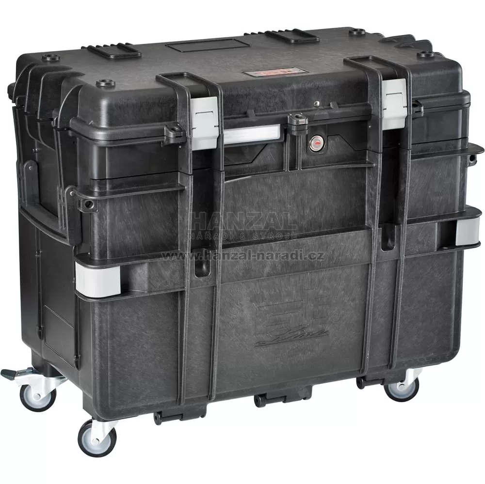 Provedení: Z rázuvzdorného polypropylenu, odolnému vůči povětrnostním vlivům, černý, se stabilními rukojeťmi na nošení, se zaskakující, ergonomickou teleskopickou rukojetí a velkými lehce jdoucími, samoolejujícími transportními kolečky. Zásuvky se mohou kompletně vyjmout, jsou však současně zajištěné proti neúmyslnému vypadnutí. Velmi pevně stojící, stohovatelný a s ochrannýma nohama. Zamykatelný skrz 4 poklopové uzávěry, jedním centrálním zámkem a visacím zámkem (není v objemu dodávky obsažený).