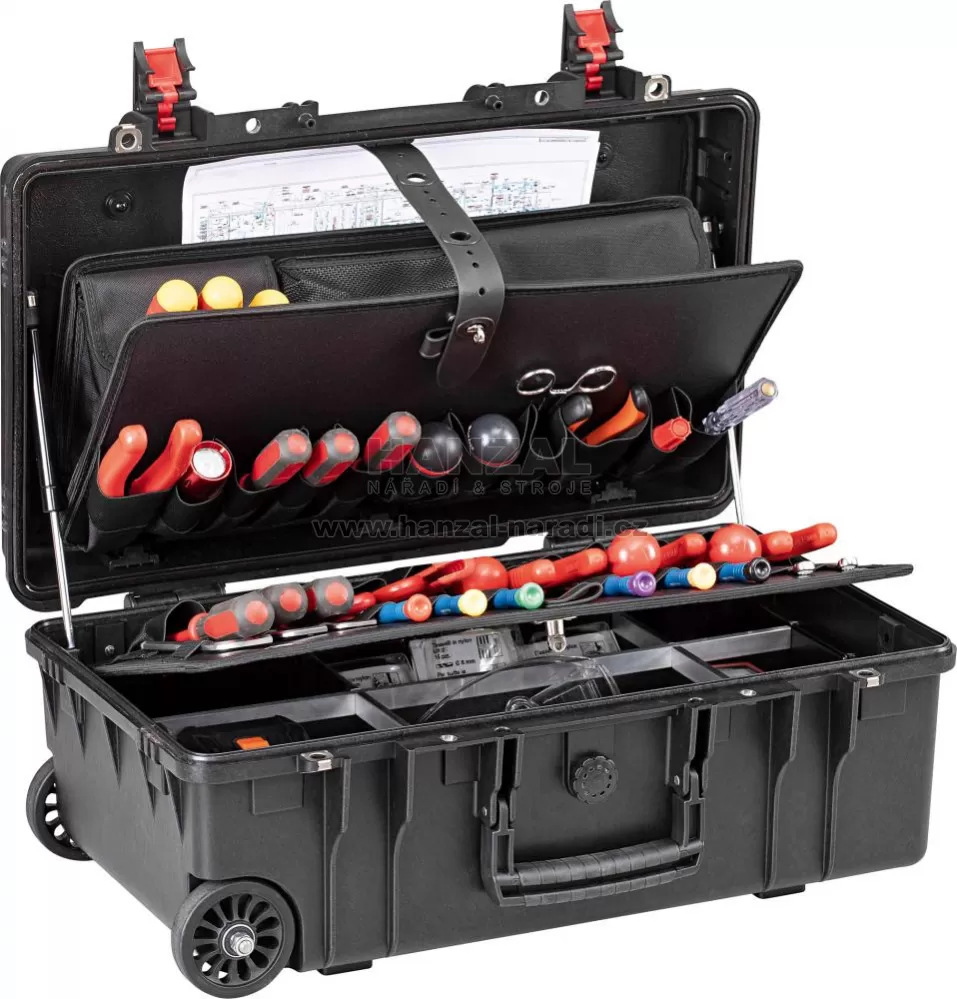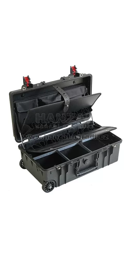 Provedení: Z odolného polypropylenu, černý, nerozbitný a nárazuvzdorný, prachotěsný a vodotěsný a tepelně odolný od –33°C do +90°C. Zavírání vzduchotěsné s ventilem pro vyrovnání tlaku. Z rázuvzdorného plastu HDPE, černý, s pevnými nástrojovými tabulemi, jakož i se stabilní rukojetí na nošení, se zaskakující, ergonomickou teleskopickou rukojetí a velkými, lehce jdoucími transportními kolečky. Výška skořepiny dna 150 mm. S plynovými vzpěrami pro snadné otevírání a zavírání. Kufr zatížitelný až do 25 kg. Velmi pevně stojící a odolný. Zamykatelný na 2 poklopové uzávěry odolné proti pádu a visací zámek (není součástí dodávky). Model vhodný pro přepravu letadlem. Dodává se bez obsahu.