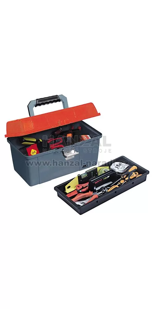 Provedení: Z plastu, odolném proti nárazu. S odnímatelným nosítkem pro drobné díly a volné nářadí. Rukojeť potažená gumou. Dodává se bez obsahu.