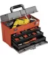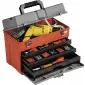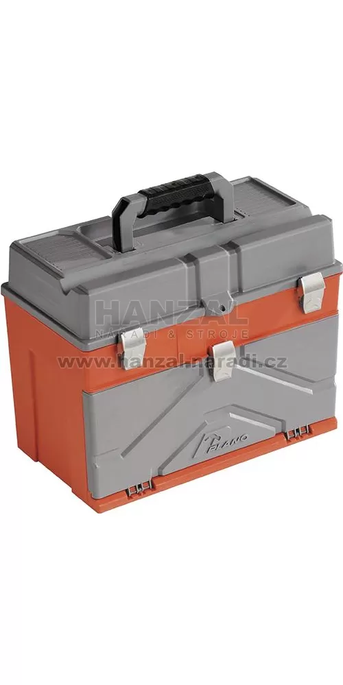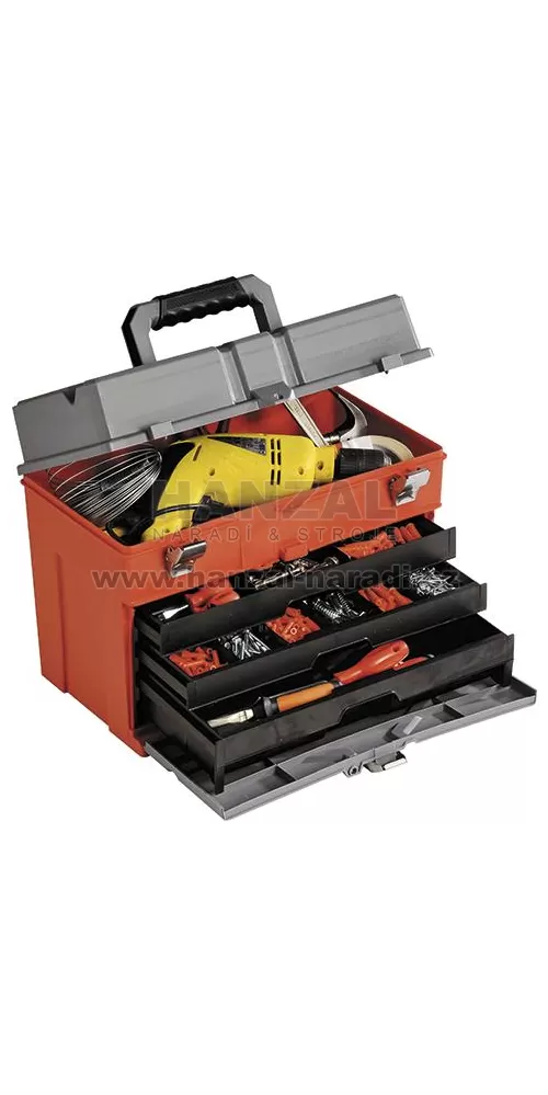 Provedení: Z plastu, odolném proti nárazu. Se třemi rozdělenými zásuvkami a jednou velkou přihrádkou. Rukojeť potažená gumou. Zamykatelný na 3 poklopové uzávěry a s přídavnou funkcí zamykání visacím zámkem (není součástí dodávky). Dodává se bez obsahu.