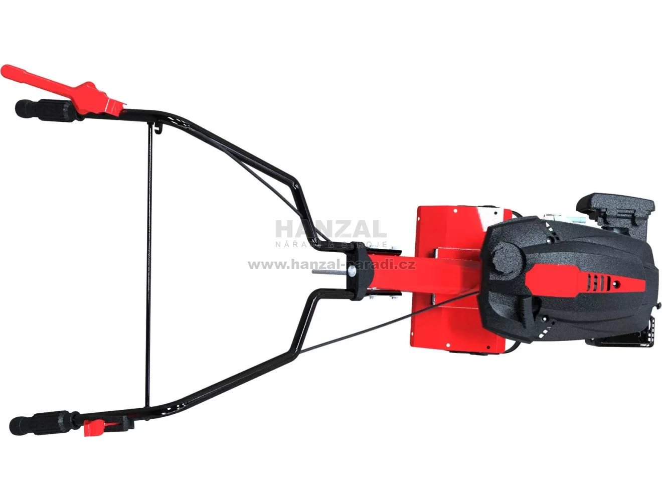• Konstrukce: široká (ergonomická) řidítka s ovládacími pákami, bezpečnostní vypínač motoru, vrchní kryty nožů, opěrná (smýkací) tyč, sklopné transportní kolo.
