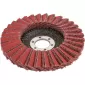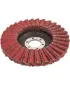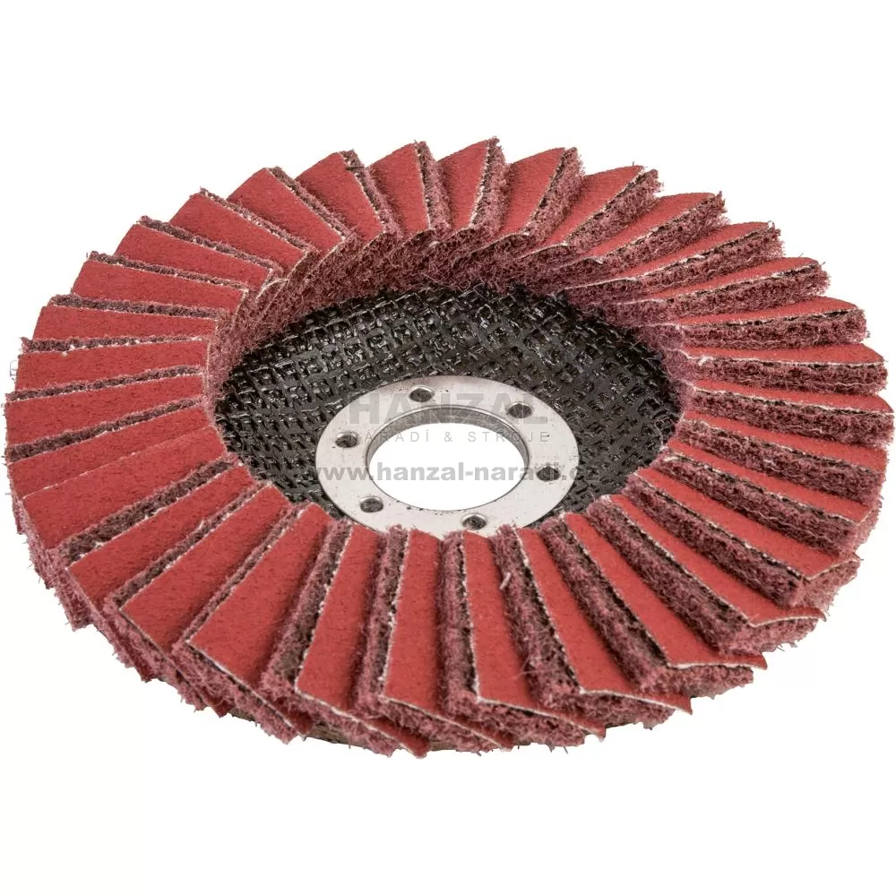 Provedení: Na kombinovaném kotouči jsou střídavě uspořádané lamely z brusného plátna a brusné plstě. Agresivní provedení, vysoce pevné usazení pryskyřicovým pojivem na vypouklém talíři ze sklotextilu.