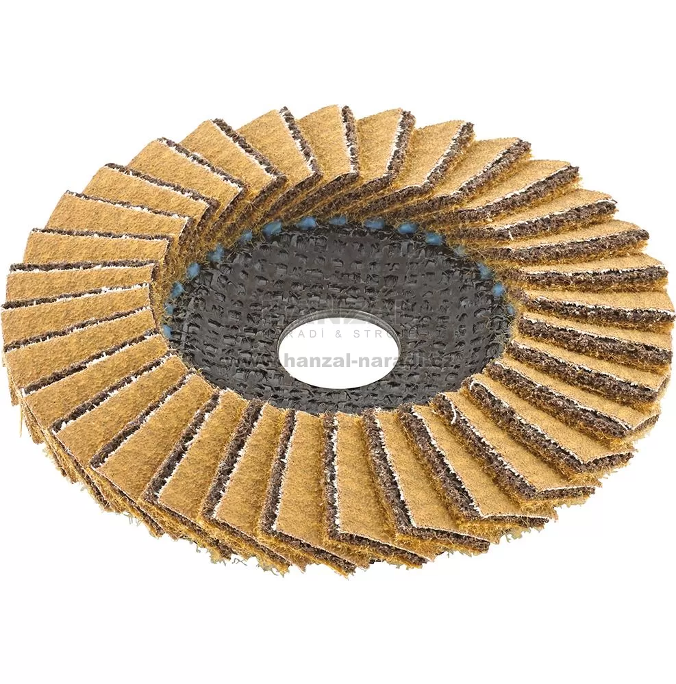 Provedení: Lamely z kompozitního složení vysoce kvalitní brusné plstě a brusných prostředků. Agresivní provedení, vysoce pevné usazení pryskyřicovým pojivem na 12° vypouklém talíři ze sklotextilu. Normovaný otvor 22,23 mm.