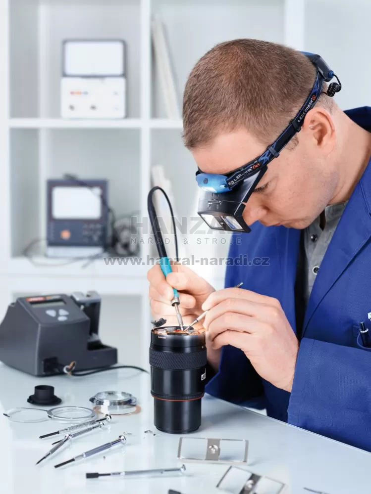 Provedení: Čelenková lupa s LED osvětlením. LED jednotku lze natáček k přizpůsobení osvětlení. Robustní kovová konstrukce k vyklápění výměnných čoček.