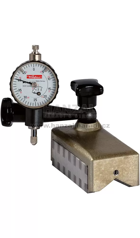 Provedení: Nízká konstrukční výška, držák na měřicí nástroje, výklopný o 360°, s křížovými šrouby pro bezpečné upnutí a zafixování. S prizmatickou magnetickou patkou a dalšími přilnavými plochami na obou podélných částech. Úchyt na úchylkoměr Ø 8 mm H7.