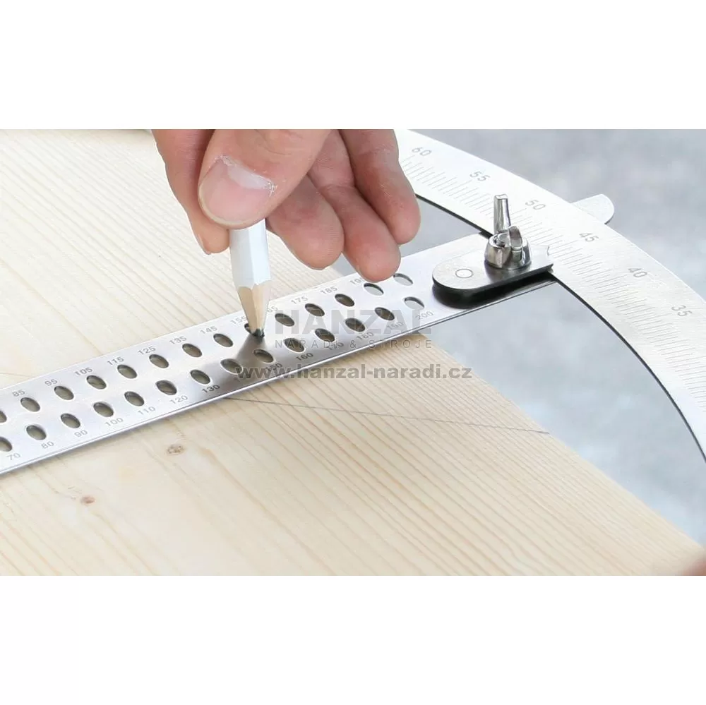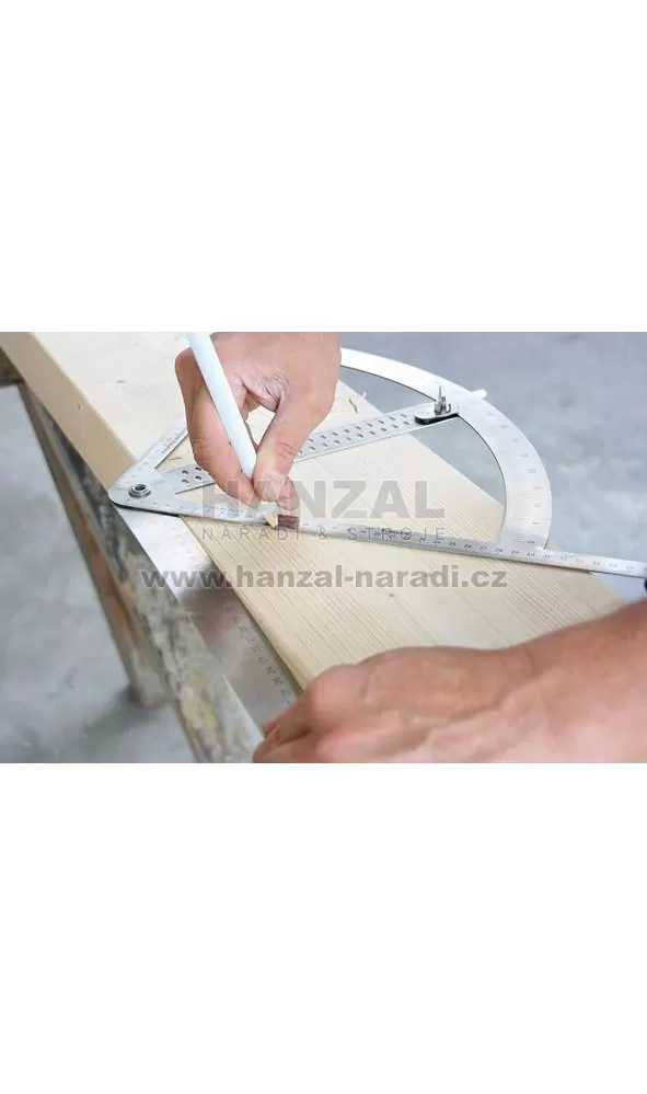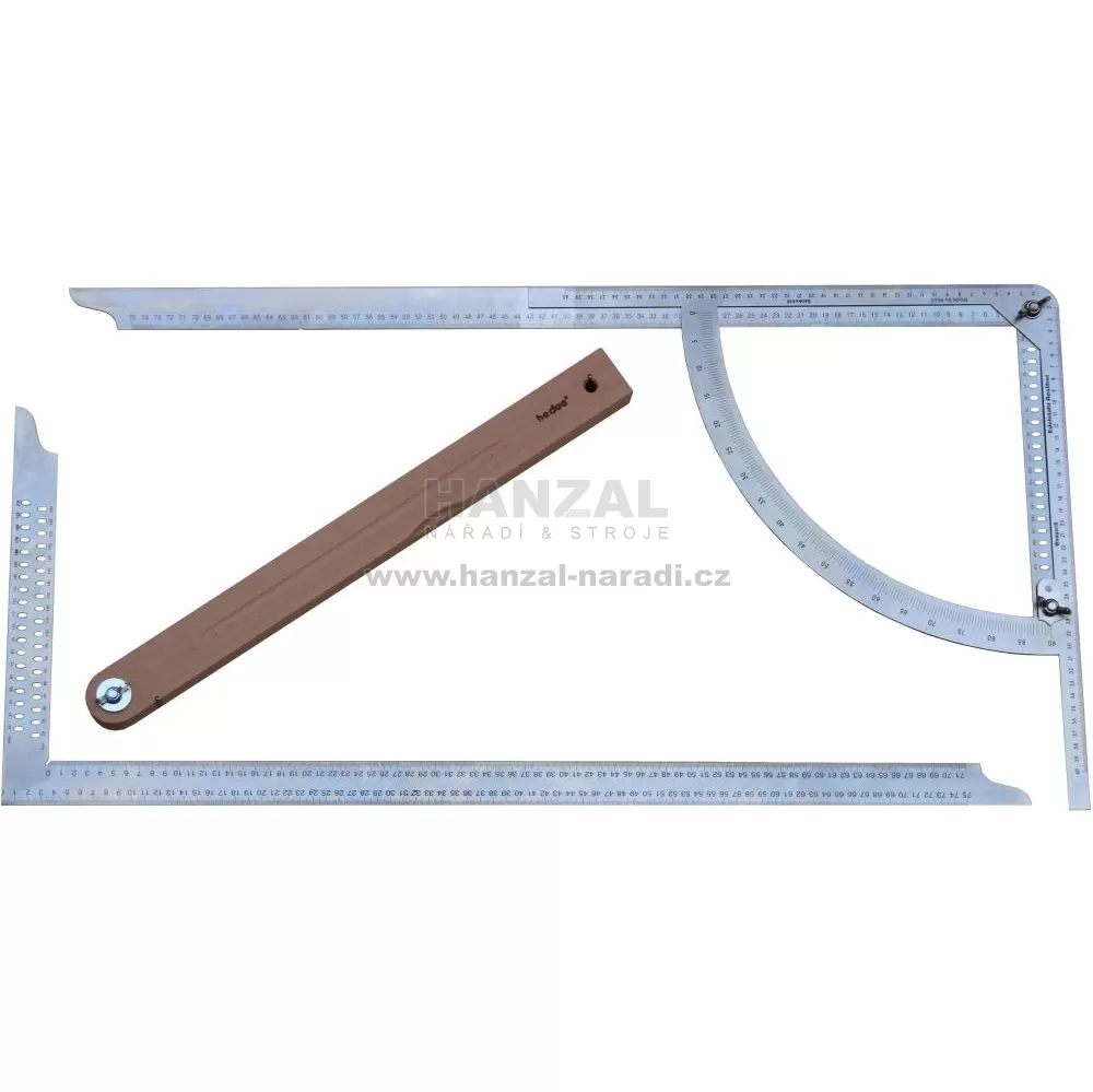 Z nerezové oceli s leptanými stupnicemi. Úhelník a čtvrt kruhu svařené beze švů. Rychlé narýsování všech vyvazovacích prací. Precizní narýsování námětkových krokví, nárožních krokví a přímých schodů, jakož i dvojitých základek.