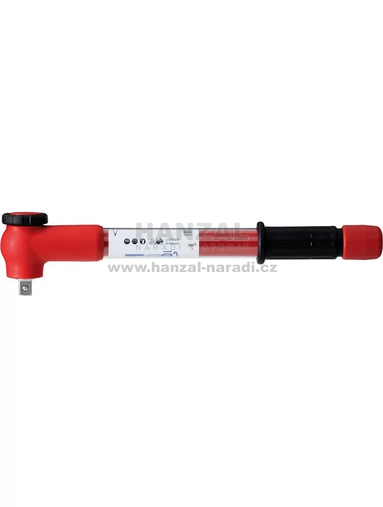Provedení: Ráčna s jemným ozubením a čtyřhranem podle DIN 3120, ČSN ISO 1174,pro řízené utahování doprava, s akustickým a hmatatelným signálem. S pojistným tlačítkem proti nežádoucímu uvolnění vložky. Izolovaná do 1000 V, podle ČSN EN 60900/IEC 60900. Rekalibrace bez zničení izolace. Klasifikace podle ČSN EN ISO 6789-2:2017 typ II třída A, kalibrováno na maximální povolenou odchylku ±3% a tedy přesnější než normou požadovaná ±4%. Dodávka včetně zkušebního certifikátu.
