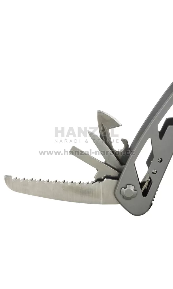 • 12 v 1: univerzální kleště s vroubkovanými čelistmi, kleště s oblými čelistmi, šroubovák standard plochý 8mm, pilník, velký nůž, šroubovák standard plochý 3 mm, šroubovák Phillips, šroubovák standard plochý 4mm, malý nůž, otvírák na konzervy, pilka, ostří na stříhání drátů