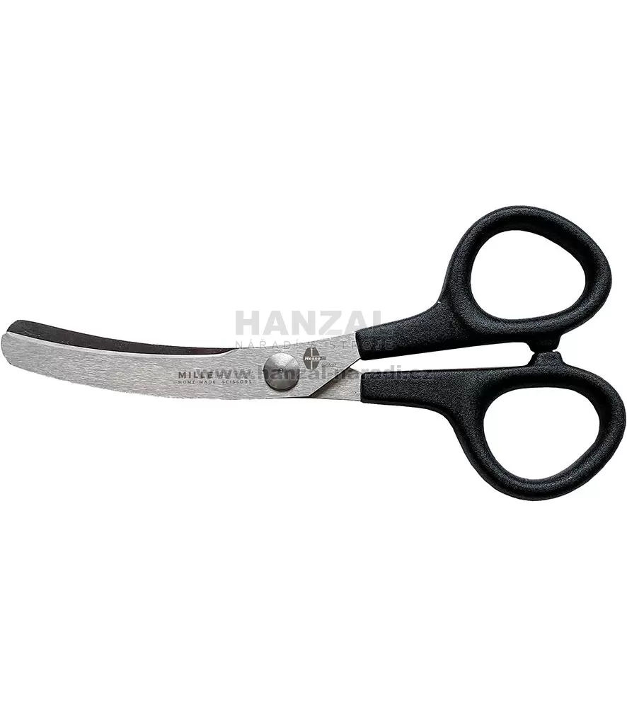 Provedení: Z nerezové oceli s hladkými, zakřivenými břity a zaoblenými špičkami. Šroubovaný kloub. Rukojeti se dvěma kulatými oky a plastovými návleky.
