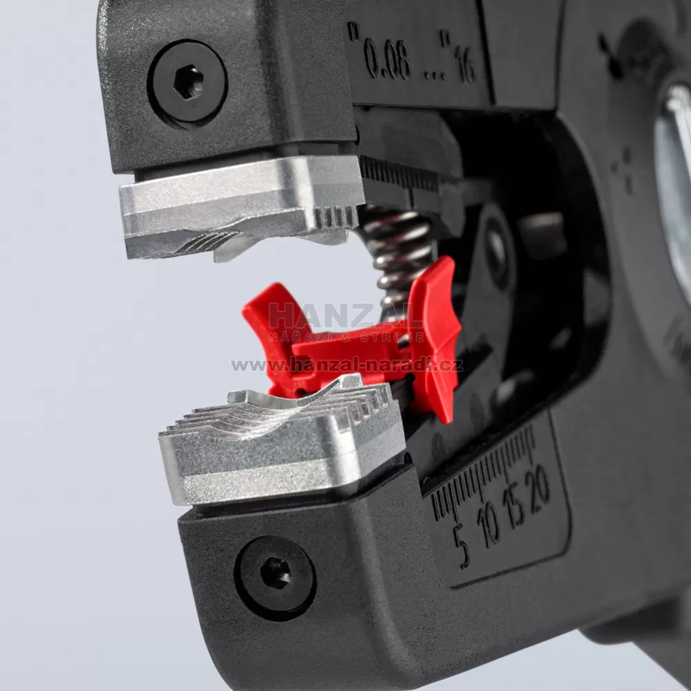 Snadné a přesné odstraňování izolace a dělení tenkých drátů i kruhových celokovových kabelů o průřezu 0,08 až 16 mm² – jedněmi kleštěmi. Dobrý úchop díky polokruhovým drážkovaným kovovým čelistem a přesný řez díky parabolické odizolovací čepeli. Patentovaný automatický mechanismus regulace hloubky střihu, neutrální bod mechanismu je možné v závislosti na podmínkách (izolační materiál, teplota) nastavovat po malých krocích. Nastavitelný délkový doraz pro trvale přesnou práci. Místo pro vlastní popisek. Pohodlná manipulace s ergonomickou dvousložkovou rukojetí. S připevňovacím okem, hodí se pro příslušenství KNIPEX Tethered Tools. Snadno vyměnitelná kazeta čepele. karton nebo blistr pro samoobslužný odběr.