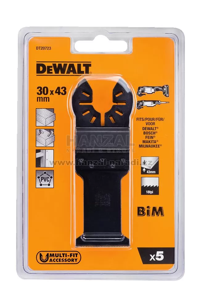 Sada 5 pilových listů 30 mm x 43 mm DT20701 Vhodné pro řezání dřeva, dřeva s hřebíky, sádrokartonových desek a PVC Celý popis