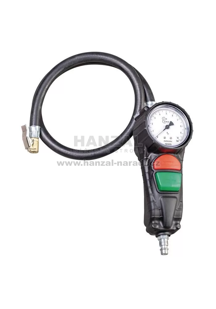 Pneuhustič s manometrem a koncovkou. Plnění a vypouštění vzduchu pomocí dvou tlačítek.