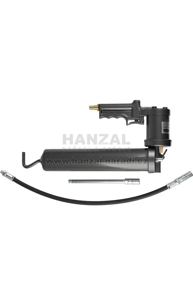 Provedení: Lakované těleso lisu z ocelové trubky, kontinuální doprava tuku pomocí pneumatického motoru. Plnění 400 g tubami podle DIN 1284, plničkou anebo volným mazivem. Spojovací závit M10 x 1. Dodává se s pancéřovou hadicí 11 x 500 mm, rovnou tryskovou trubkou 150 mm a přesnou špičkou 4 BA, M10 x 1.