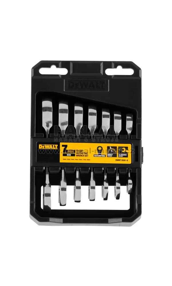 7dílná sada metrických leštěných ráčnových krátkých klíčů DEWALT® zahrnuje širokou škálu ráčnových klíčů. Sada obsahuje klíče 10, 12, 13, 14, 15, 17 a 19 mm. Tyto klíče mají 72 zubů, stačí jim pootočení o 5° a používají technologii DirectTorque.