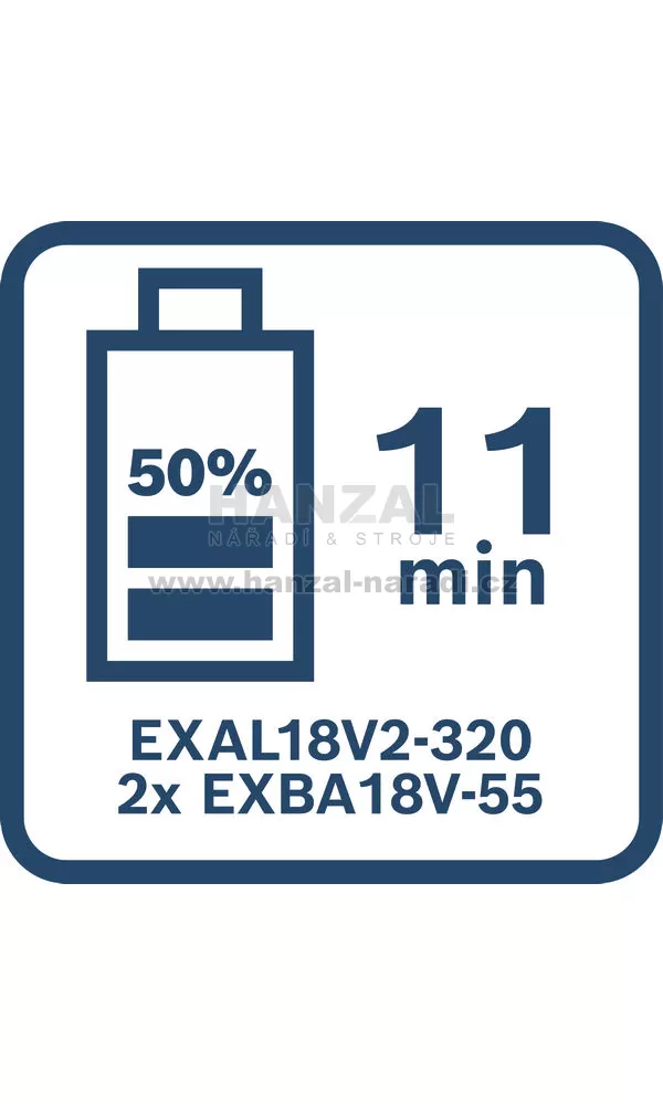 • Ultrarychlé paralelní nabíjení: Nabíjecí proud 16 A nabije dva akumulátory EXBA18V-55 za 31 minut a dva akumulátory EXBA18V-80 za 39 minut