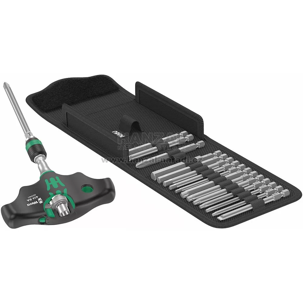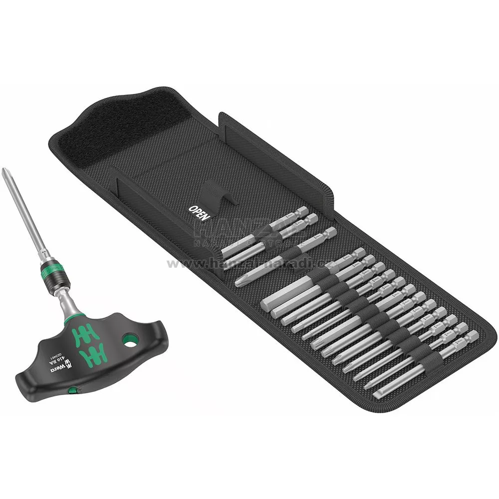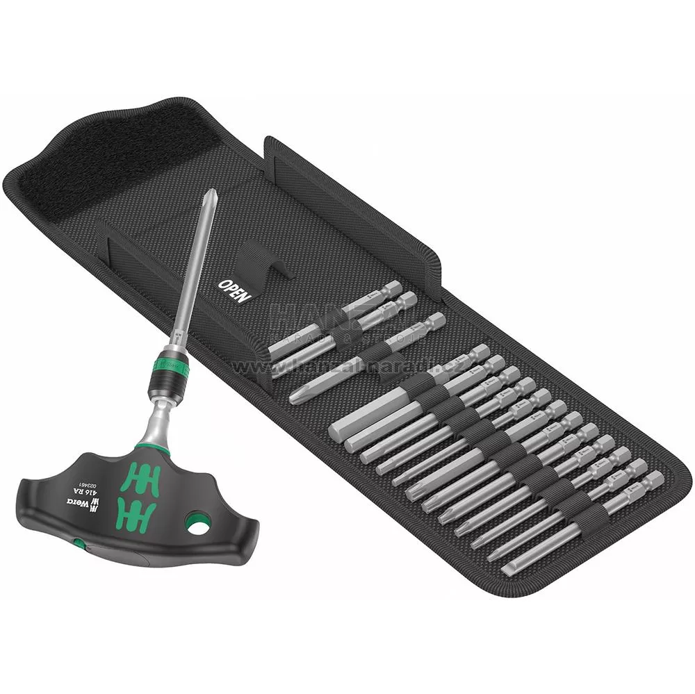 Provedení: S bity, tvrdý typ. Držák bitů s příčnou rukojetí s funkcí ráčny a rychlovýměnné sklíčidlo Rapidaptor. Ráčna s jemným ozubením (80 zubů, zpětný úhel 4,5°) integrovaná v dvousložkové rukojeti se postará o bezpečnou a rychlou práci. Držák bitů Rapidaptor s rychlo-otočným pouzdrem umožňuje rychlo výměnu bitů. Bity a rukojeť jsou přehledně uspořádány ve skládací tašce.