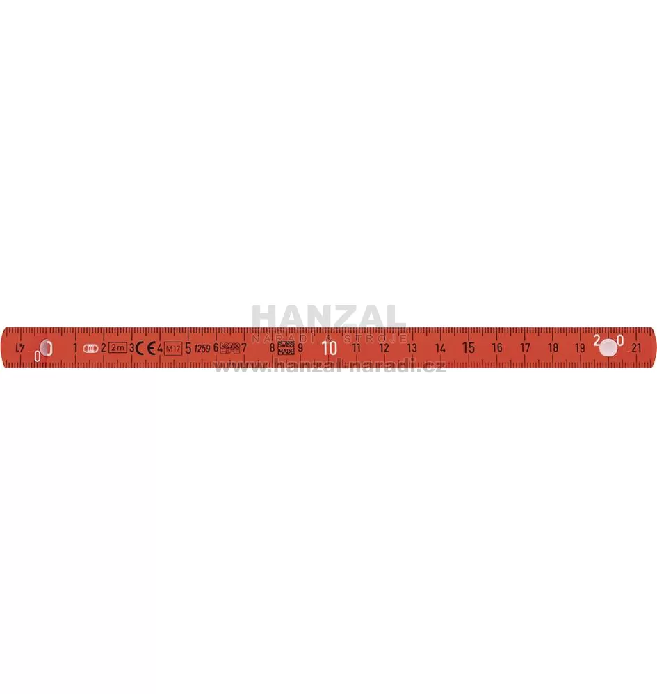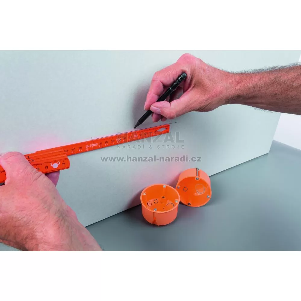 Provedení: Z plastu, barva oranžová, černá hluboce vyražená stupnice v mm na horní a dolní hraně článků s bílým označením desítkových hodnot. Tuhý. Integrovaná přidržovací funkce pro kabely v rozsahu 3–7 mm. Stupnice rozteče krabic až pro 3 elektrické krabice pod omítku a značka rozteče okrajů 150 mm. Díky UV světlu ho snadno najdete i za špatného osvětlení.