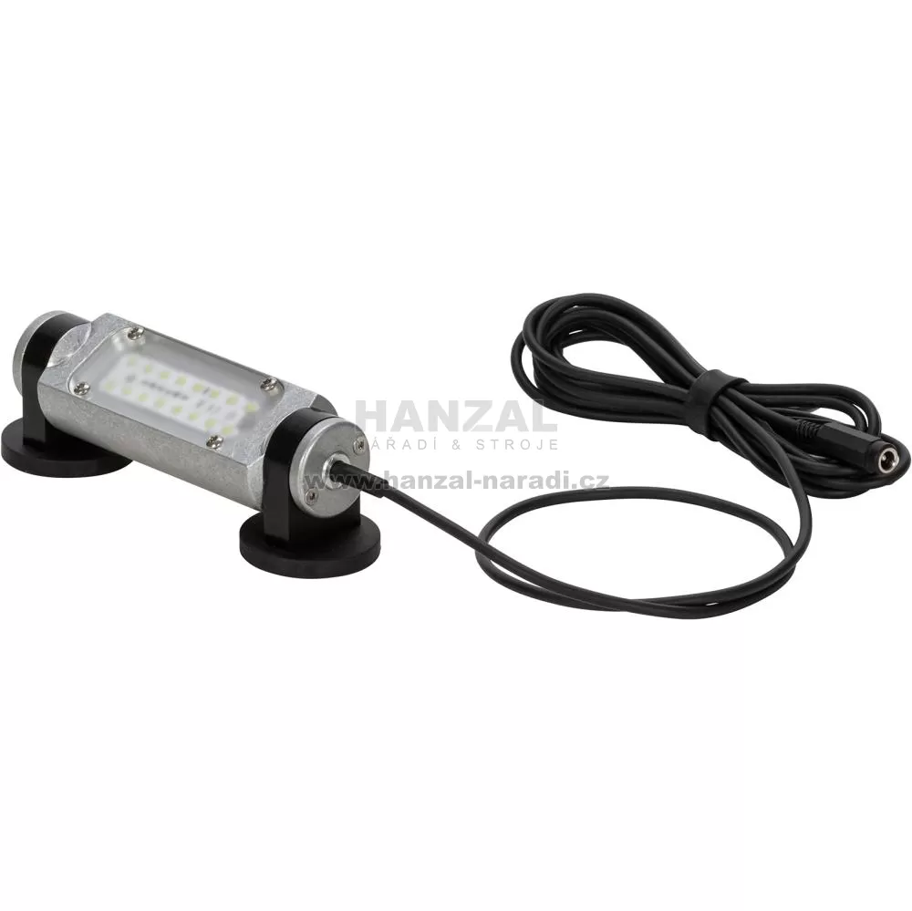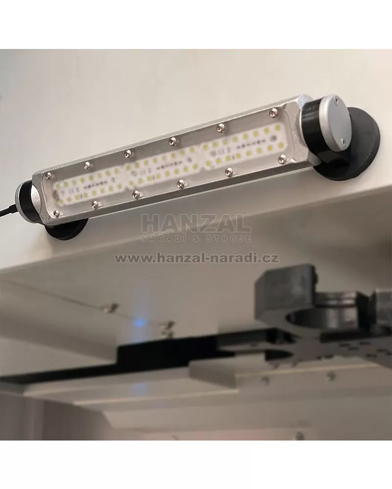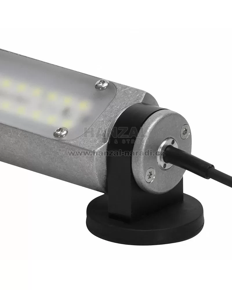 Provedení: Hliníková hlava svítidla se satinovaným akrylátovým sklem před LED světelným čipem. Hlavu svítidla lze otočit o 360°, Rovnoměrné osvětlení s nízkou odrazivostí a bez oslnění a blikání. Magnetické patky s gumovým opláštěním pro přímou montáž na stroj. Ochrana proti prachu a stříkající vodě až po spojku napájecího zdroje.