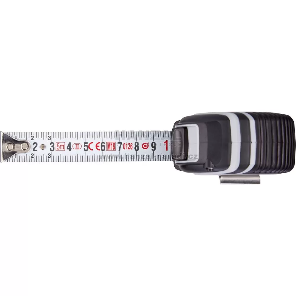 Provedení: Z klenuté a tvrzené nerezové oceli s duplexní stupnicí v mm, ve vysoce odolném pouzdře z ABS plastu. Povrchová úprava pásma čirým lakem za účelem ochrany proti opotřebení. Automatické svinutí stisknutím tlačítka Stop, pohyblivé okování na začátku pásu pro vnější a vnitřní měření.