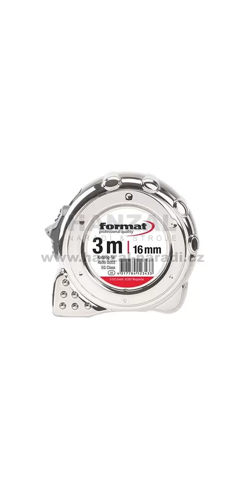 Kapesní svinovací metr, pochromované pouzdro, FORMAT Provedení: Páska z klenuté a tvrzené pásové pružinové oceli, bílý lak, v odolném… Celý popis