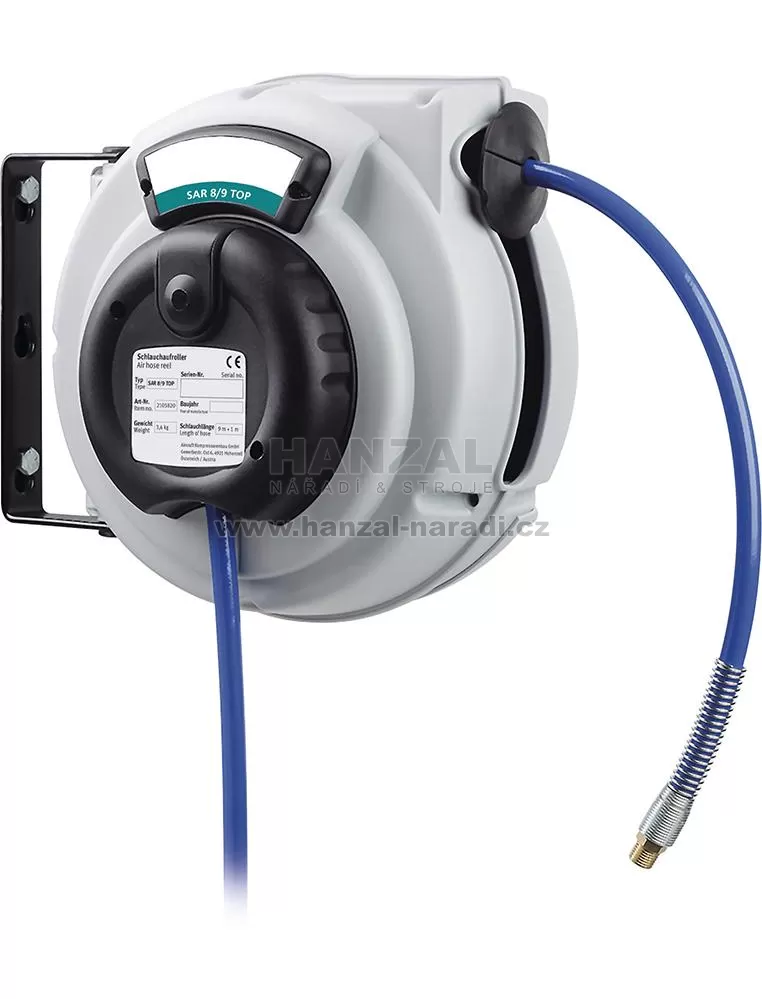 Provedení: Kompaktní, robustní, nárazuvzdorné a otočné těleso pro montáž na stěnu nebo strop. S blokovacím zařízením pro zajištění pneumatické hadice proti zpětnému chodu, v případě potřeby odpojitelné. Vrtané pružiny jsou vyrobeny z oceli a zabezpečují úplný a rovnoměrný zpětný chod pneumatické hadice. Dodává se s pneumatickou hadicí z polyuretanu s ocelovou spojkou a přípojným závitem 1/4“(vněj. záv.).