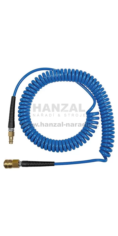 Provedení: Oboustranně spojená s pružinou proti zalomení, jakož i rychlouzavírací spojkou a spojovací zástrčkou jmen.sv. 7,2. Elastická polyuretanová hadice má velmi velkou sílu vrácení do původní polohy, je prostorově úsporná díky malým vinutím a snadno se s ní manipuluje. Hadice má dobrou absorpci vibrací a vynikající odolnost proti oděru.