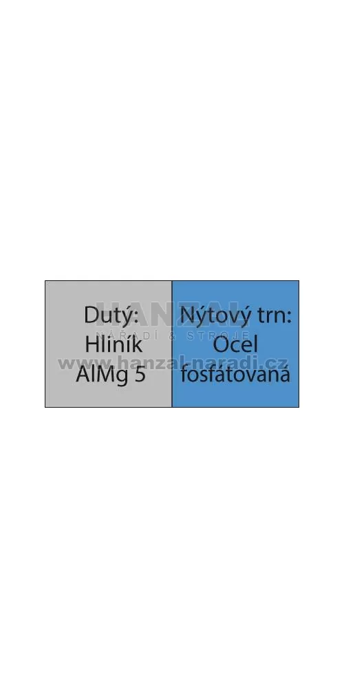Provedení: Dutý nýt z hliníku AlMg 5, nýtový trn z fosfátované oceli.