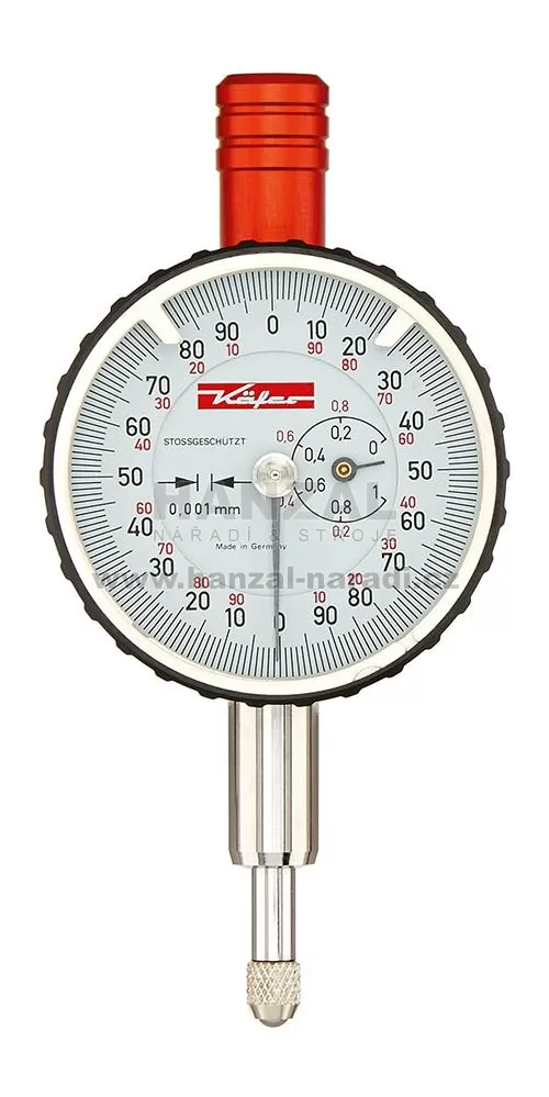 Provedení: S ochranou proti nárazu a precizním ozubeným měřicím mechanismem s vysokým rozlišením měřených hodnot. Nejdůležitější části měřicího mechanismu jsou uložené v rubínových kamenech. Precizně vedené pouzdro nad měřicím čepem je umístěný a odpružený takovým způsobem, že se náraz nepřenáší na mechanismus úchylkoměru. Dodává se v plastovém boxu.