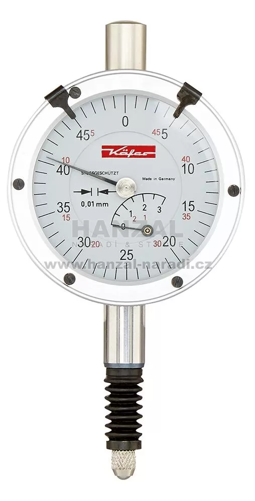 Provedení: Ochrana proti nárazu, měřicí čep a upínací stopka (Ø 8 mm h6) z odolné nerezové oceli, měřicí čep lapovaný. Precizně vedené pouzdro nad měřicím čepem je umístěný a odpružený takovým způsobem, že se náraz nepřenáší na mechanismus úchylkoměru. S pryžovým měchem na měřicím čepu a kroužkovým těsněním na stupnici a zadní stěně za účelem ochrany proti účinkům kapalin a nečistot. Dodáváme v pouzdru.