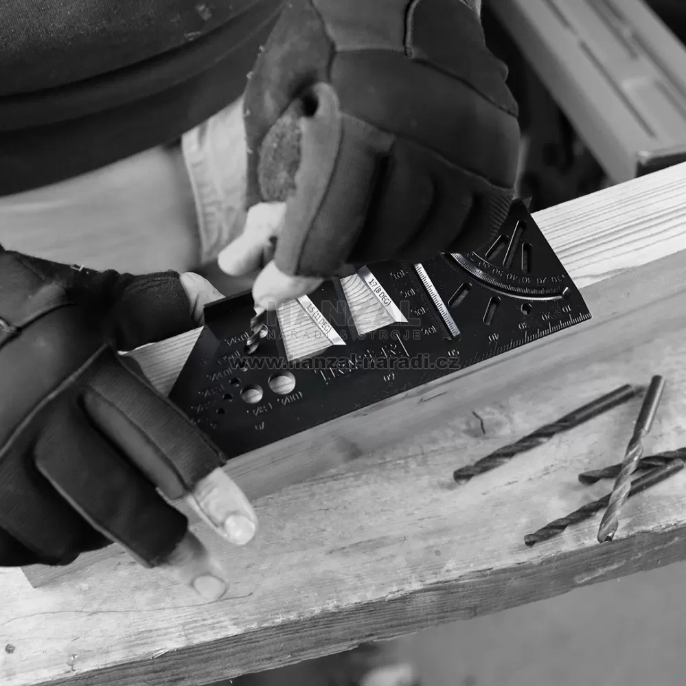 TRACER ProMitre je užitečným pomocníkem každého tesaře, stavitele, truhláře či řemeslníka. Spojuje výhody několika různých nástrojů v jednom a má více než 8 funkcí. Vodorovná a svislá úhlová stupnice: ideální pro značení úhlů od 10 do 80° (+ připravené otvory pro 30, 45 a 60°). Díky dvojité stupnici můžete vyznačit úhel na více plochách dřeva najednou. Zarážky pro rovnoběžné kreslení - na jedné straně úhelníku je mřížka přednastavených otvorů vyznačených po 1 mm - ideální pro značení rovnoběžných čar od 1 mm do 55 mm.