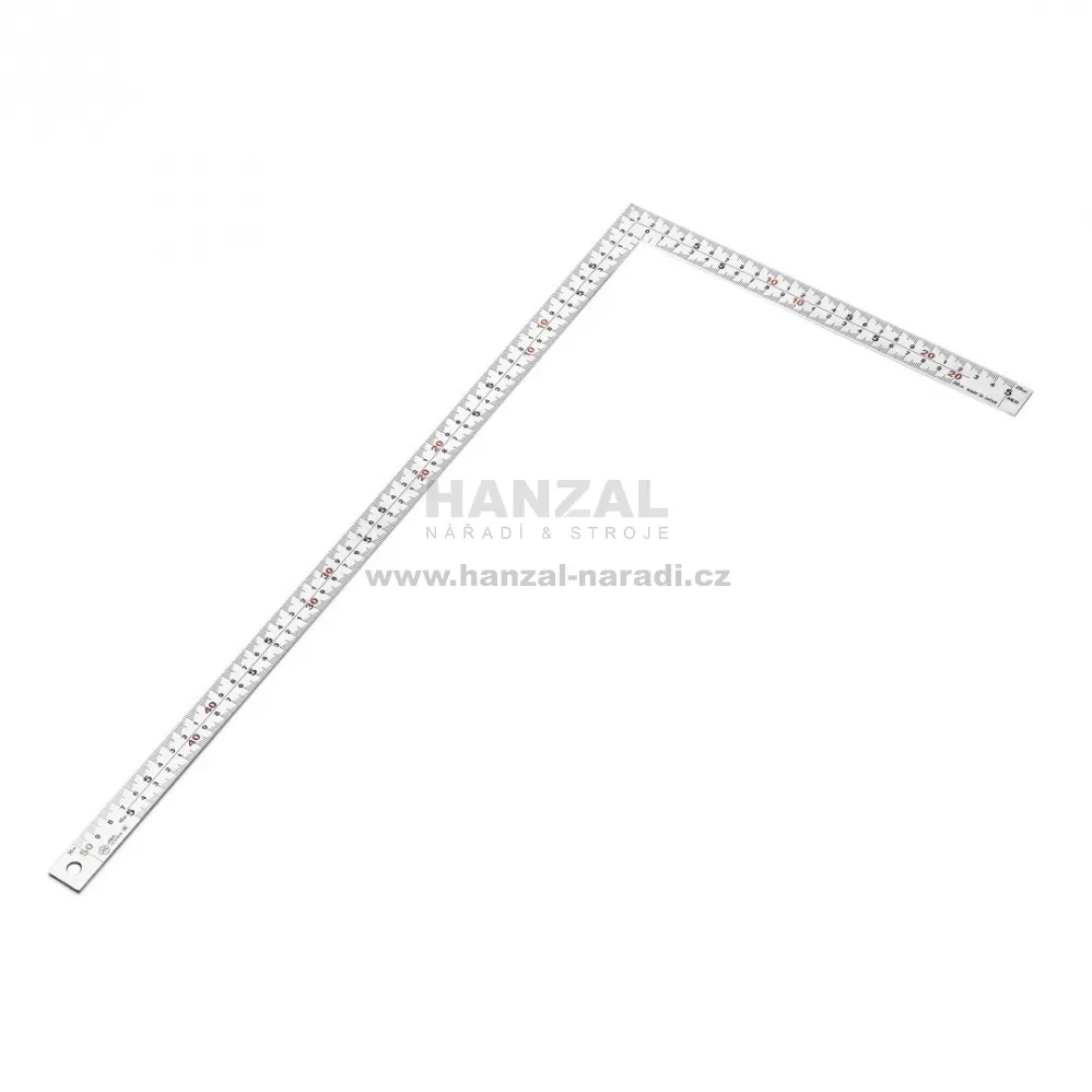 Praktický nerezový úhelník s metrickou stupnicí 50 cm. Díky očku zavěsíte kdekoliv v dílně.