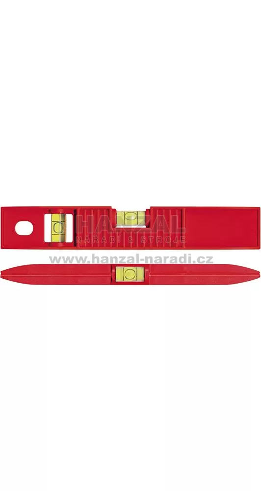 Provedení: Z červeného ABS plastu s výztuhou ze skleněných vláken. Se zaoblenou horizontální a vertikální libelou a 2 kotoučovými magnety. Přesnost měření v běžné poloze 1 mm/m.